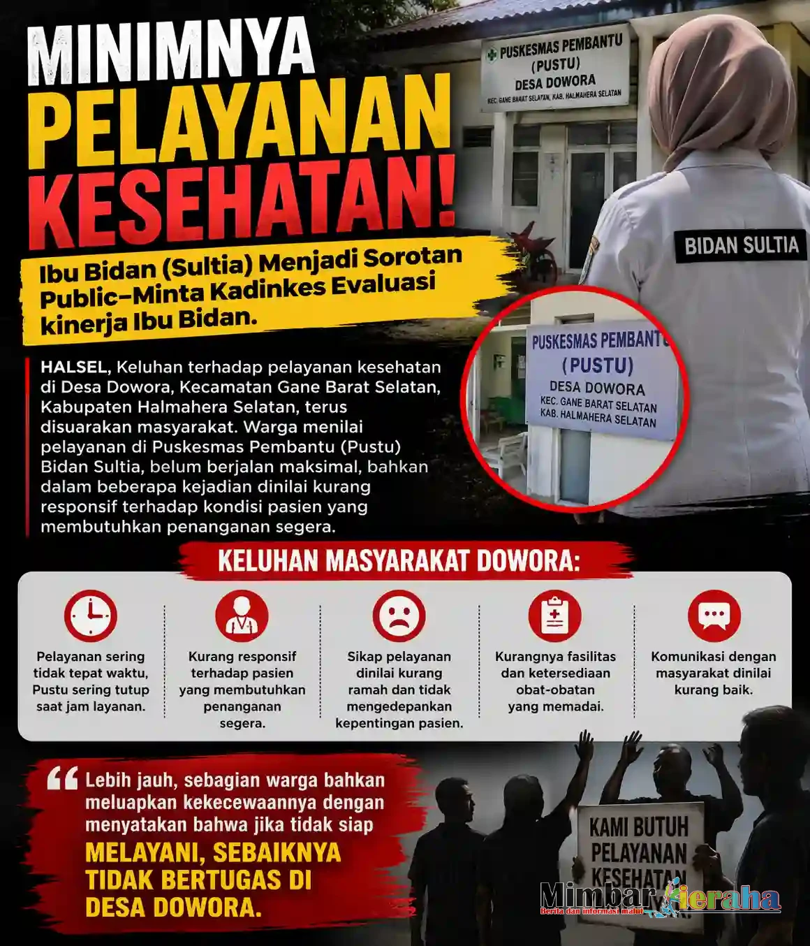 Selain itu, warga juga meminta perhatian serius dari Dinas Kesehatan Kabupaten Halmahera Selatan Asia Hasyim, untuk melakukan evaluasi terhadap kinerja tenaga kesehatan di Pustu Dowora. Pengawasan dan pembinaan dinilai penting agar pelayanan kepada masyarakat dapat berjalan optimal sesuai standar yang telah ditetapkan pemerintah.