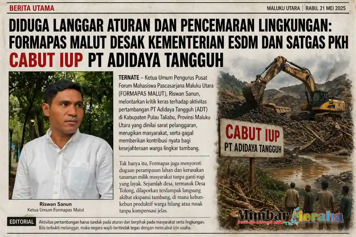 “Negara tidak boleh kalah oleh korporasi. Jika terbukti melanggar, maka tidak ada alasan lain selain mencabut IUP PT Adidaya Tangguh. Ini demi keadilan masyarakat dan penyelamatan lingkungan di Pulau Taliabu,” tutup Riswan.